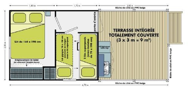 Coin nuit : Une chambre avec 1 lit double (140×190), une chambre avec 2 lits simples (80×190) côte à à côte, oreillers et couvertures ou couettes fournis.